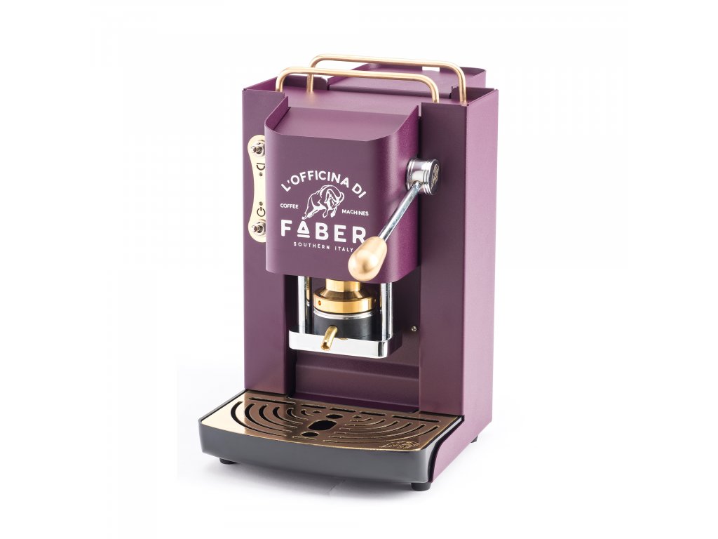 Kvalitní italský kávovar FABER SLOT PRO DELUXE MAT VIOLET na přípravu E.S.E. POD espressa, materiál nerez v nové edici v matné fialové barvě se zlatými doplňky, nahřívací plocha na hrnky